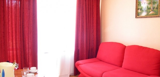 В номере: диван (еврокнижка), кресло, TV на тумбе, кондиционер, внутренний телефон, круглый стол, бра, картина, кухня-студия, или встроенная(холодильник, полка с набором столовой и чайной посуды, электрочайник), ковер, выход на балкон, прихожая, 2-спальная или две 1,5-спальные кровати, тумбочки, бра, коврики, туалетный столик, два встроенных платяных шкафа, кондиционер, радио, выход на балкон.