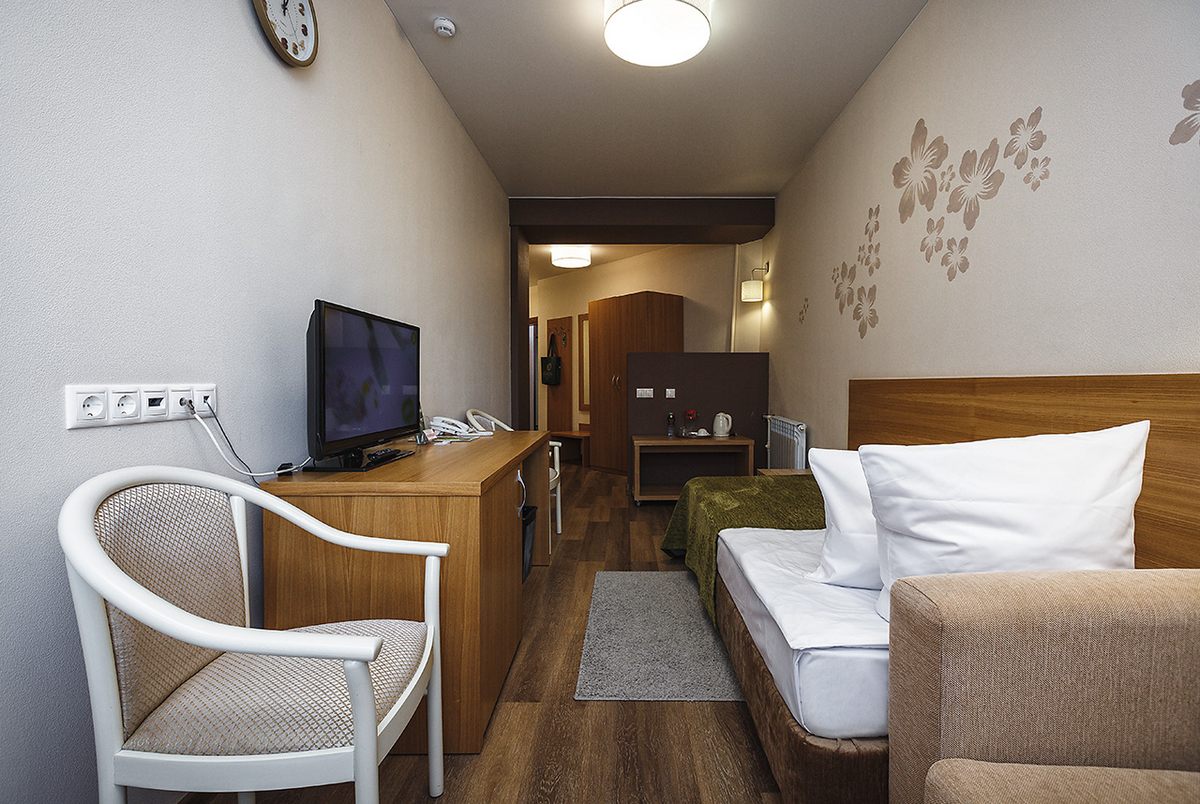 В номере: две односпальные кровати или рдна двуспальная, прикроватные тумбочки, шкаф, столик журнальный, туалетный столик, телевизор, телефон, чайник, холодильник, сушилка для белья