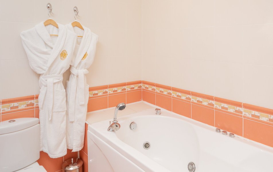 Санузел: джакузи, душевая кабина или ванна, раковина, унитаз, фен, тапочки, туалетные принадлежности