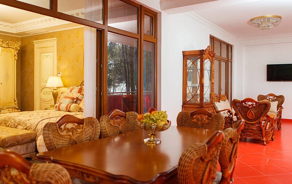 В номере: диван, комод, набор мягкой мебели, прикроватные тумбочки, стол, стулья, шкаф для посуды, кондиционер, телевизор, холодильник, электрочайник